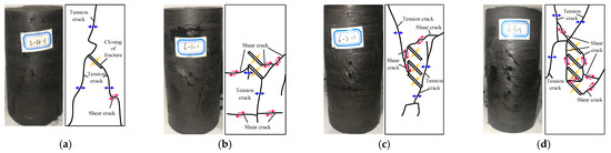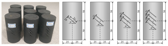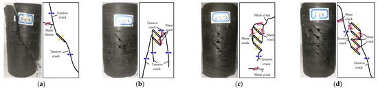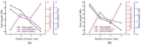 - The stress–strain curve of the fractured coal specimens can be divided into four stages: the micro-fracture compaction stage, the elastic deformation stage, the unstable crack propagation stage and the post-peak stage. With the increase of the number of prefabricated cracks, the post-peak stage curve changes from rapid drop to step-down drop, indicating that with the increase of the number of prefabricated cracks, the brittleness of coal specimens decrease gradually. With the increase in the number of prefabricated cracks, the elastic modulus and peak strength decrease gradually. The failure mode of coal specimen changed from overall tensile failure to tensile-shear mixed failure.