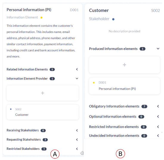 TranspVis includes the SitReq form. Figure 4B shows the stakeholders details in the SitReq form by selecting one of them (for example, Customer) from the circle. The user can observe the ID, name, description, and related keywords and IE of the selected stakeholder (e.g., produced, obligatory, optional, restricted, and/or undecided information elements). As a result, we can see all the details described in Section 2.1.1.