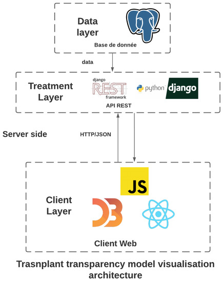 We employ the client–server architecture for the implementation after conducting research on the most applicable architectures. On the server-side (back-end), where data persist and are processed, we use the Django Framework and Django Rest API (https://www.djangoproject.com/ [accessed on 10 November 2022]) to create the REST API that the front-end will consume. The database is based on PostgreSQL (https://www.postgresql.org/ [accessed on 10 November 2022]), and all required and processed data will be consistently stored in it, with the Django Framework handling all transactions and data processing. For the client-side (front-end) portion of our data-driven visual analytics visualization, we selected React Library and D3 (https://d3js.org/ [accessed on 10 November 2022]) as a client-side (front-end) solution that makes the visualization possible for our requirements, enables the implementation of the specification, and enables the addition of new advanced specifications. We use JSON format on the front-end to visualize and manipulate data sent from the database using D3. This will make it simple to implement and maintain the visualization criteria and specifications. The back-end (https://github.com/abdennour001/transpvis-front, accessed on on 10 November 2022) and front-end (https://github.com/abdennour001/transpvisback, accessed on on November 2022) code for TranspVis is accessible on GitHub. Figure 9 summarizes all these technical considerations.