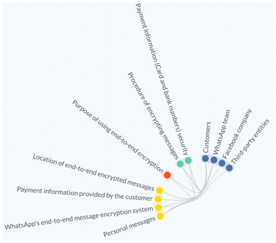 - [C1] Visual encoding: In the Shield diagram, the WhatsApp team stakeholder is repeated twice, and the customer stakeholder is repeated three times. All incoming and outgoing relationships in the TranspVis circles are linked to the unique appearance of these two stakeholders in the main circle. Other visual structure notes are the same as AWS visual encoding (see Figure 11).