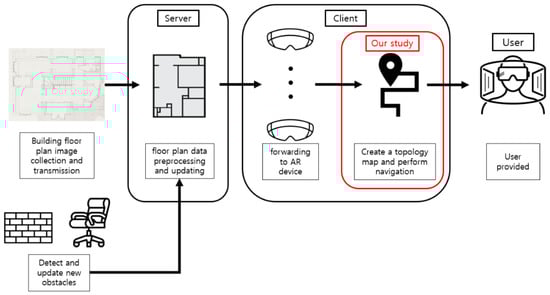 AR navigation considers the structure of the building and the locations of all rescue personnel. However, not only is the existing GPS focused on the outdoors [3,4], but also indoor navigation using GPS is difficult because GPS signals are weak or blocked in urban areas and inside buildings [5,6,7,8]. In addition, indoor disasters may create new obstacles such as collapses [9].