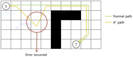 The computational time and type of error depend on the heuristic value used with A*. Figure 2 shows an example of a distortion that may occur when using the straight-line distance from the selected node to the destination as the heuristic value. Distortion arises because the evaluation function assigns a low score to the wrong path compared with the ideal path, even though there is an obstacle between the origin and destination. The A* algorithm’s performance also decreases when a high-resolution image is provided and there are many obstacles on the map. This is because each pixel must be used as a node in the absence of a topology map.