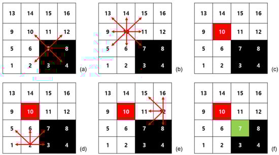 Figure 4a represents the process of searching for data adjacent to a diagonal line by selecting data node (No.) 7 from among 16 cells. The reason for searching only the diagonal data of the eight directions is that if a node is created in the diagonal direction, it can be created in any corner, and the number of operations can be reduced by not exploring all eight directions.
