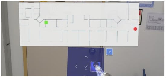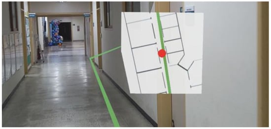 The generated path is displayed on top of the mini-map, and the route is guided through HoloLens 2. Figure 11 shows the virtual object for navigating superimposed on top of the real world viewed through HoloLens 2.