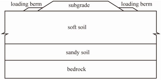 Marine soft soil is distributed widely in the Yancheng area of Jiangsu Province, China. The Yancheng-Lianyungang Highway crosses an island that is rich in water. The strata of the island are mainly divided into three layers. The upper layer includes a variety of soft soils. The middle layer is sandy soil. The lower layer is the bedrock, as shown in Figure 2. The width of the subgrade top is 33 m, and the subgrade height is 6 m. The slope angle of the subgrade is 1:1.5. To keep the subgrade stable, the loading berm was used in this engineering. However, on the north side of the island, there is a large-scale fish pond near the subgrade. The fish pond cannot be expropriated. Near the fish pond, there are not enough constructed spaces for the loading berm. In this paper, an embedded loading berm (ELB) is proposed to address the problem. The ELB means that the berm is embedded into the soft soil. The ELB width is smaller than that of the loading berm and then the construction space is saved. To meet the subgrade stability requirement, the ELB height should be increased. The materials of the ELB can be the same as those of the subgrade. The ELB can save construction space to protect the fish pond. However, the influence of ELB on subgrade stability is unclear.