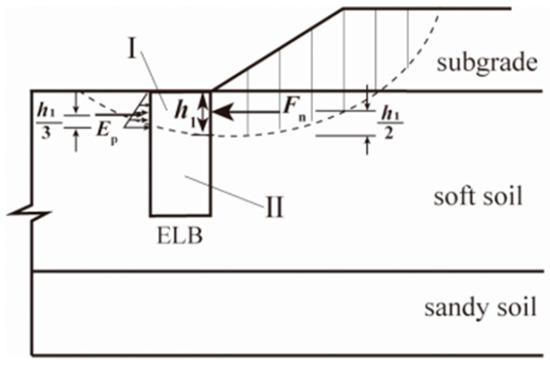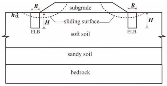 The ELB and subgrade were made from compacted soil. Their strength is much greater than that of the soft soil. When the ELB strength is not enough, the subgrade is prone to shear failure as shown in Figure 3. To quantitatively analyze the subgrade stability factor, the following assumptions are made. The position of the sliding surface does not change with the increase in subgrade width and height. That is, h1 remains unchanged.