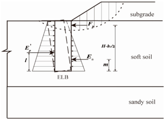 Assuming that the strength of the ELB is great enough, ELB shear failure does not occur. The overturn failure will occur as shown in Figure 5. Ea is the active earth pressure; Fn is the landslide pushing force; and E′p is the passive earth pressure. l is the distance from the E′p application point to the ELB bottom. m is the distance from the Fn application point to the ELB bottom.