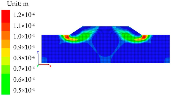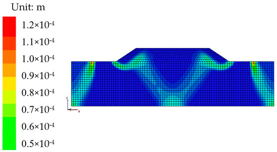 Figure 8 shows the shear strain increment contour of the model with ELB. The height and width of the ELB are 6 m and 10 m, respectively. Figure 8 demonstrates that the sliding surface does not run through the subgrade and the sliding failure does not occur in the subgrade. The stability factor of the subgrade is 1.26. This tells us that the stability of the subgrade can be improved by the ELB.