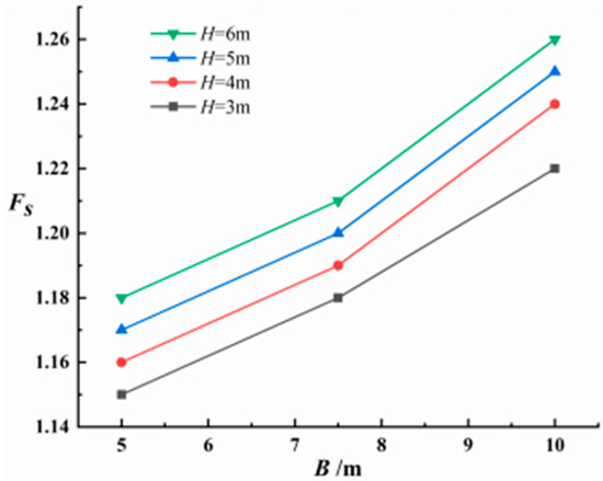 For a given subgrade and the site, the physical and mechanical parameters are determined. Then, W is a constant value. In Equation (6), only Fs and B are variables. From Equation (6), it can be seen that the stability factor Fs is positively correlated with the ELB width B. With the increase in the ELB width, the subgrade stability factor Fs increases accordingly.