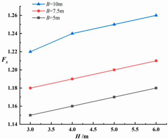 Figure 10 shows the relationship between the stability factors and the ELB height (B = 5 m, B = 7.5 m, B = 10 m). The stability factors increase gradually with the ELB height increase. This is also agreeable with the analytical results in Section 3.2. The relationship between the stability factors and the ELB height was fitted using a linear equation. The fitting formula and correlation coefficients are shown in Table 3. The correlation coefficients are equal to or more than 0.97. This implies that the linear equation is good for fitting the relationship. From Table 3, it is seen that the slope of the fitting formula is 0.01 for the ELB width B = 5 m and B = 7.5 m. The slope is 0.013 for the ELB width B = 10 m. The slopes of the fitting formula increase with the ELB width increase.