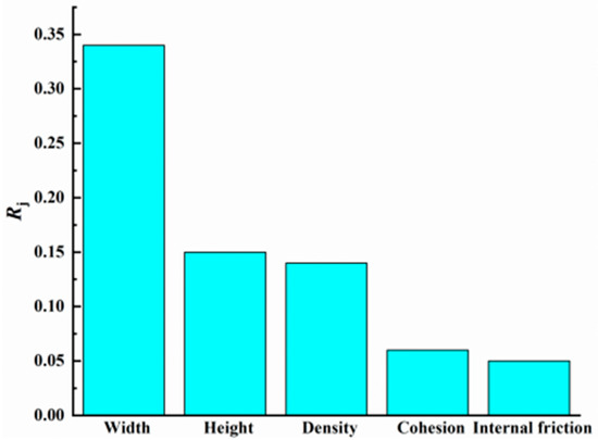 The RB is higher than RC. This means the sensitivity of the geometric parameters (width, height) is higher than that of the physical and mechanical parameters. The RC is higher than RD, which shows the ELB density’s sensitivity to the stability factors is higher than that of ELB cohesion. The ELB parameter sensitivity order is as follows. Width > height > density > cohesion > internal friction.
