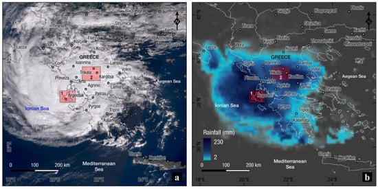 (a) Medicane Ianos over Greece, Sentinel-3 OLCI true color image acquired on 18 September 2020, one day after Medicane landing. (b) Satellite precipitation (NASA IMERG) of 18 September 2020. Overview boxes show the location of the two studied areas; 1—Cephalonia island, 2—western Thessaly.