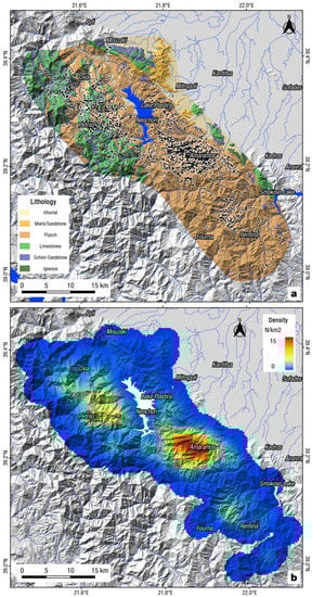 The oldest post-alpine sediments in the area are the Molassic formations of the Mesohellenic trench [,]. The majority of the area is covered by the flysch formation of the Pindos geotectonic unit [,,]. Flysch formation consists of alternations of shales, sandstones, and limestones that are highly susceptible to slope failures. Bedrock formations of the Alpine units also include limestones and cherts of Pindos, Koziakas and Sub-Pelagionian zones, while ophiolites can be found in the eastern and southwestern border of the area [,,].