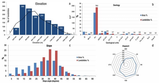 As shown in Figure 4, about 40% of the generated landslides were mapped on elevation ranging from 400 to 800 m; approximately 21% of the total number of landslides was documented from 400 to 600 m and 19% was reported on areas located between 600 and 800 m elevation. On higher elevation areas, the percent of slope failures was 13.91% between 800 and 1000 m, 15.26% between 1000 and 1200 m, and 10.49% for areas at elevation from 1200 and 1400 m. A lower percentage of slope failures has been identified at an elevation higher than 1400 m while a sharp decrease of landslides is related to areas located higher than 1800 m and lower than 400 m elevation. These statistics make sense as the areas located at high elevation are limited, while the latter outcome is due to the spatial distribution of geological units. More specifically, the lower parts of the study areas are mostly flat and covered by Quaternary sediments (loose clays, gravel and sand) and not by the flysch formation, which as it is demonstrated next is the predominant unit for landslide triggering among the geological units, along with slope gradient and relief.