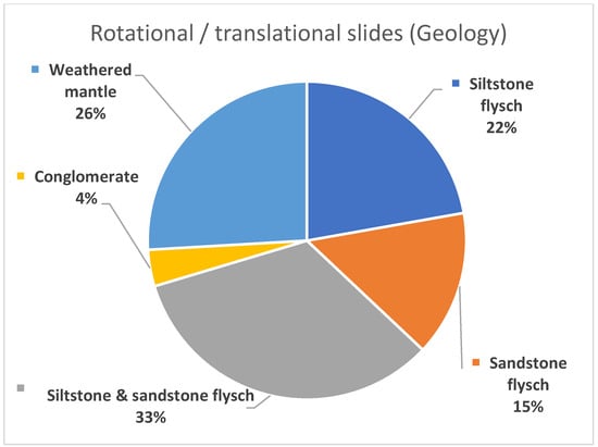 - Rotational and translational landslides formed mainly in siltstone flysch and siltstone and sandstone flysch in alternations. Those landslides are characterized by a complex geometry with their lower part frequently consisting of a slump that follows the geometry of a stronger underlying bed. In many cases, the accumulated material covered the road without resulting in a complete failure.
