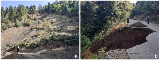 Few days after the landfall and occurrence of Medicane Ianos, several teams of engineering geologists and engineers participated in field surveys aiming to map and document as many as possible slope failures, and validate the preliminary inventory produced based on remote sensing techniques []. This combination of desktop studies, remote sensing and field survey was also applied for documenting earthquake-induced secondary effects few kilometers to the east of the here study area, triggered by a seismic sequence, which occurred in March 2021 [].