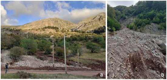 - Debris flows in fractured limestones, scree, sandstone/conglomerate flysch. These were encountered in areas with steep morphology with deep gullies where mass transport of rock pieces and boulders was favored. These failures, i.e., debris flows, heavily impacted the road network and some villages located at higher elevations.