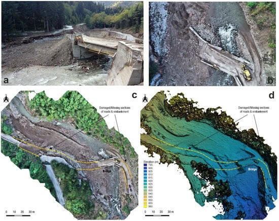 Damaged bridge crossing of Karitsiotis River near Belokomiti. Ground (a) and vertical aerial (b) images of the damaged bridge undergoing repairs on 1 October 2020. UAS orthophoto (c) and digital surface model (d) of the Karitsiotis River bridge area (surveys 1 October 2020).