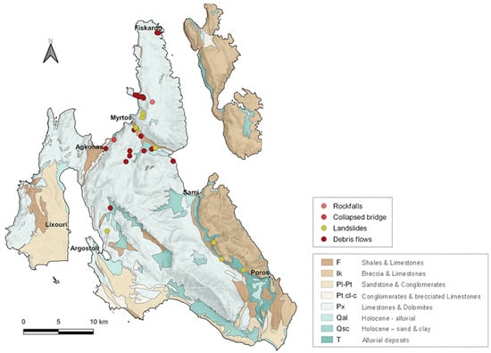 Lithological map of Cephalonia Island with observed landslides and related phenomena following Medicane Ianos. Modified from [,].