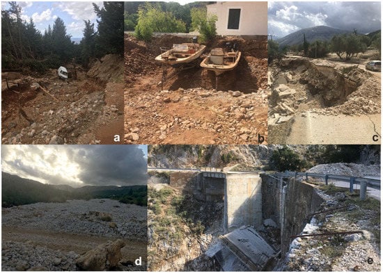 Moreover, the erosion and flooding of the Karitsiotis River damaged and blocked the road crossing south of Belokomiti village, Plastira Lake, as shown in Figure 9. Although the bridge itself did not collapse, road embankments on both sides were partially or completely washed out. The intersection of the roads west of the bridge was the most damaged part, blocking road traffic towards communities to the south and west of Lake Plastira. Riverbank erosion also caused several slope failures, while the flooding of the river caused slope undercutting that resulted in road failures (Figure 9).