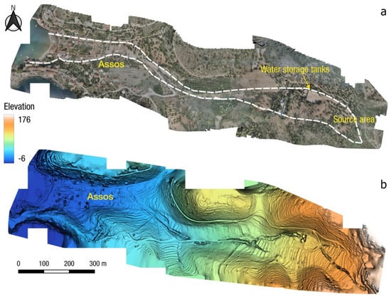UAS-enabled mapping of Assos village debris flow and surrounding area (3D model can be viewed at: https://skfb.ly/6WyTT (accessed on 2 July 2022)): (a) orthophotomap and (b) digital surface model (surveyed on 30 September 2020).