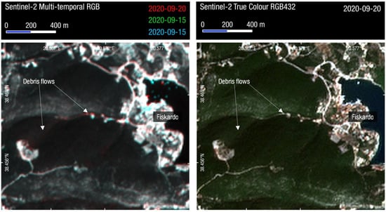 (Left): Sentinel-2 multi-temporal composite (Band 4) Fiskardo, Cephalonia. (Right): Sentinel-2 true color composite (Bands 4-3-2). Red colors mark the location of debris flows upstream of Fiskardo.