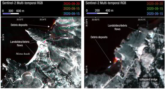 Sentinel-2 multi-temporal composites (Band 4) of central Cephalonia. (Left): Mirtos beach area; (Right): Site of collapsed bridge on the E.O. Argostoliou-Fiskardou (38.3195° N, 20.5081° E). Red colors mark the location of debris flows, landslides and deposition of debris along the coast.