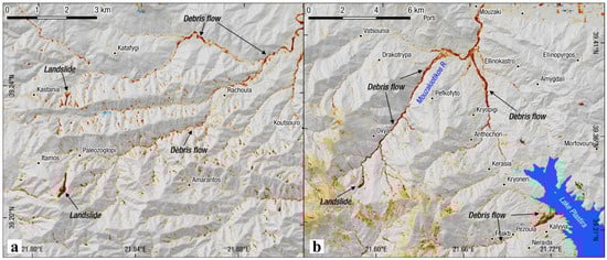 Regarding the second case, located in the area between Pefkofito and Vlassi (Figure 8b), it should be pointed out that this area is characterized by steep morphology while the extensive amounts of debris have been transported via deep gullies from higher elevations.