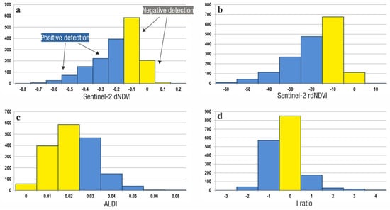 Histograms of pixel values by automated mapping methods corresponding to mapped landslides; (a) [], (b) HazMapper by [], (c) ALDI [] and (d) SAR backscatter change by []. Yellow bars mark negative detections and blue bars positive detection, based on set threshold values for each method.