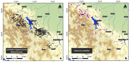 Comparison of (a) Medicane Ianos triggered landslides (black dots) and (b) historical occurrences of landslides in the region (purple dots).
