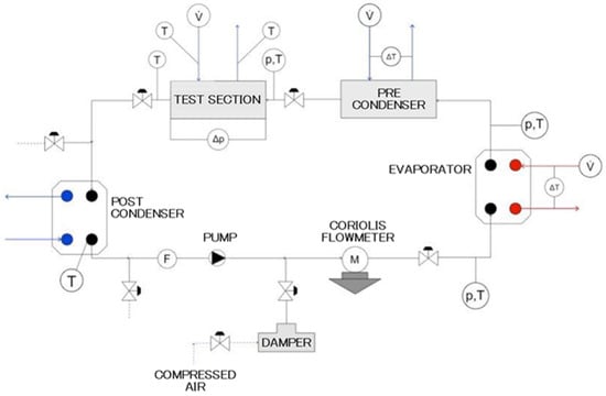 The experimental facility, which is located in the Heat Transfer in MicroGeometries Lab of the University of Padua, is a liquid pumped circuit, which allows setting the desired conditions at the inlet of the test section by adjusting the heat flow rate exchanged in a pre-condenser, which is fed by superheated vapor coming from an evaporator/superheater. The pre-condenser is a tube-in-tube heat exchanger: the refrigerant flows in the inner tube, whilst cold water, supplied by a water-cooled chiller, flows in the annulus. By controlling both the water flow rate and the temperature, it is possible to set the vapor quality at the inlet of the test section. The refrigerant mass flow rate is measured using a Coriolis effect mass flow meter, with an accuracy of ±0.1% of the reading. More details concerning the experimental facility can be found in Mancin et al. []. A schematic of the experimental test rig is represented in Figure 1.