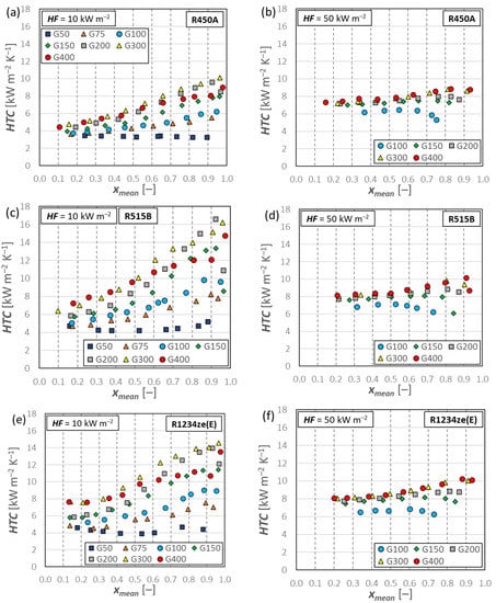 Heat transfer coefficient vs. mean vapor quality at tsat = 30 °C for R450A at HF = 10 kW m−2 (a) and 50 kW m−2 (b), for R515B at HF = 10 kW m−2 (c) and 50 kW m−2 (d), and for R1234ze(E) at HF = 10 kW m−2 (e) and 50 kW m−2 (f). G50 = 50 kg m−2 s−1, G75 = 75 kg m−2 s−1, G100 = 100 kg m−2 s−1, G150 = 150 kg m−2 s−1, G200 = 200 kg m−2 s−1, G300 = 300 kg m−2 s−1, and G400 = 400 kg m−2 s−1.
