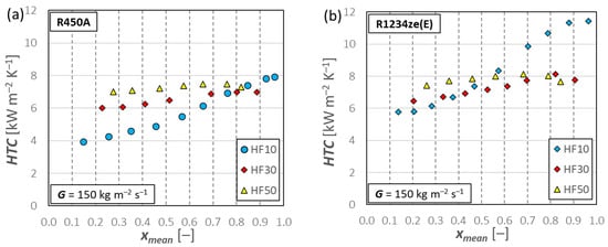 Heat transfer coefficient vs. mean vapor quality at tsat = 30 °C at G = 150 kg m−2 s−1 for R450A (a) and R1234ze(E) (b). HF10 = 10 kW m−2, HF30 = 30 kW m−2, and HF50 = 50 kW m−2.