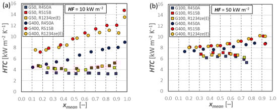 A direct comparison between R450A, R515B, and R1234ze(E) is shown in Figure 5, which reports data at HF = 10 kW m−2 (Figure 5a) and at HF = 50 kW m−2 (Figure 5b), considering the lowest and highest mass velocities tested for each heat flux. R515B and R1234ze(E) showed similar values of the heat transfer coefficient at both HF = 10 and 50 kW m−2; indeed, these two fluids have similar thermophysical properties. At HF = 10 kW m−2 and G = 400 kg m−2 s−1, which is a condition where convective boiling highly affects the phase change process, R515B and R1234ze(E) had considerable higher heat transfer coefficients compared to R450A, due to its weaker convective properties. The situation changed at HF = 50 kW m−2, in particular at G = 100 kg m−2 s−1, which is a condition where nucleate boiling plays a strong role in the flow boiling process: The properties more favorable to nucleate boiling of R450A seem to mitigate its properties less favorable to convective boiling, and as a result, the heat transfer coefficients of R450A are close to those of R515B and R1234ze(E).