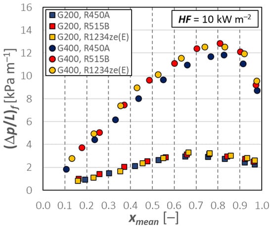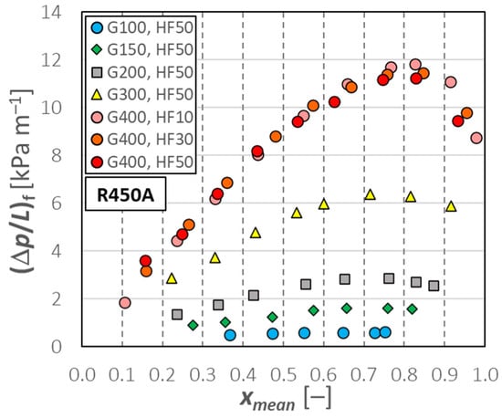 Frictional pressure gradient for R450A vs. mean vapor quality at tsat = 30 °C. G100 = 100 kg m−2 s−1, G150 = 150 kg m−2 s−1, G200 = 200 kg m−2 s−1, G300 = 300 kg m−2 s−1, and G400 = 400 kg m−2 s−1. HF10 = 10 kW m−2, HF30 = 30 kW m−2, and HF50 = 50 kW m−2.