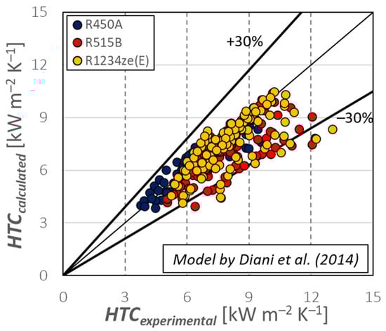 Among the tested empirical models, the model developed by Diani et al. [] is the one that better predicts the experimental values of the heat transfer coefficients. The model was developed from an experimental database comprising data during flow boiling of R1234ze(E) inside a microfin tube with an inner diameter at the fin tip of 3.4 mm, and the authors proposed a correlation for the prediction of the heat transfer coefficient in the pre-dryout region. The model was validated with data covering mass velocities from 190 to 940 kg m−2 s−1 and heat fluxes from 10 to 50 kW m−2. The model considers the contribution of nucleate boiling and convective boiling, as well as the geometrical parameters of the microfin tube. A general overview of the accuracy of the model is given in Figure 8.