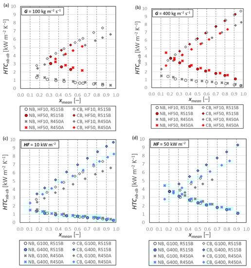 The flow boiling heat transfer coefficient can be seen as the sum of a term due to nucleate boiling and a term due to convective boiling, but it is not possible to distinguish the two contributions from the experimental tests. Since the model of Diani et al. [] is the one that better predicts the experimental heat transfer coefficients, it was implemented here to estimate the effects of both nucleate boiling and convective boiling. Figure 9a,b show the effect of heat flux on the two contributions for a mass flux of 100 kg m−2 s−1 (Figure 9a) and 400 kg m−2 s−1 (Figure 9b) for R515B and R450A. The two contributions had an opposite trend with respect to vapor quality. Convective boiling was highly affected by the vapor quality, and it increased as vapor quality increased: the estimated heat transfer coefficient due to convective boiling at a mean vapor quality of 0.8 was about 2.2 times the value at a mean vapor quality of 0.2. On the contrary, the effect of nucleate boiling decreased as the vapor quality increased. The comparison between the fluids confirmed what highlighted from the analysis of the experimental data, i.e., R515B has a stronger convective boiling contribution compared to R450A: the convective boiling heat transfer coefficient of R515B was about 18% higher than that of R450A. The analysis of Figure 9a,b revealed that the heat flux has no effect on the estimated convective boiling contribution, whereas it highly affects the nucleate boiling contribution: considering a mean vapor quality of 0.4, the nucleate boiling heat transfer coefficient at HF = 50 kW m−2 was 3.1 times the value at HF = 10 kW m−2 in the case of R450A, whereas it was 2.8 times in the case of R515B. Moreover, it appears that R450A had a stronger contribution of nucleate boiling compared to R515B. Figure 9c,d show the effect of mass velocity on the two contributions at HF = 10 kW m−2 (Figure 9c) and at HF = 50 kW m−2 (Figure 9d) for R450A and R515B. The heat transfer coefficient due to convective boiling at G = 400 kg m−2 s−1 was, on average, 19% higher than that at G = 100 kg m−2 s−1, and R515B showed a convective boiling contribution that was 20% higher compared to R450A.