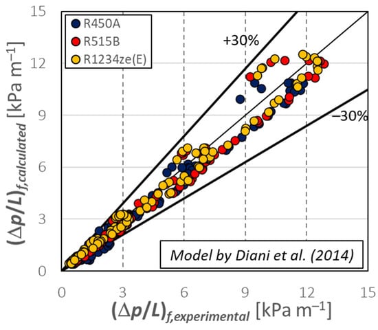 In addition to models for the estimation of the heat transfer coefficients, models for the evaluation of frictional pressure drops are needed for a complete design of evaporators. The following models were selected for the comparison against the experimental data: Kedzierski and Goncalves [], Diani et al. [], and Rollmann and Spindler []. Only data characterized by an experimental pressure gradient higher than 0.5 kPa m−1 were considered in the following comparisons in order to omit data with high experimental uncertainty. The model of Kedzierski and Goncalves [] considers the homogeneous model for the momentum term and a friction factor that considers the presence of fins for the frictional contribution; considering the three fluids, the model was able to predict the experimental pressure drop with a relative and absolute deviation of −12.1% and 20.5%, respectively. The models of Diani et al. [] and of Rollmann and Spindler [] estimate the frictional pressure drop; considering the three fluids, the model of Diani et al. [] presented a relative and absolute deviation of −4.6% and 11.1%, respectively, whereas the model of Rollmann and Spindler [] presented a relative and absolute deviation of −8.2% and 20.4%, respectively. Table 5 summarizes the relative and absolute deviations of the implemented models split for each tested refrigerant. Figure 10 reports the calculated frictional pressure gradient plotted against the experimental counterpart for the model developed by Diani et al. [], which presents the lowest deviations.