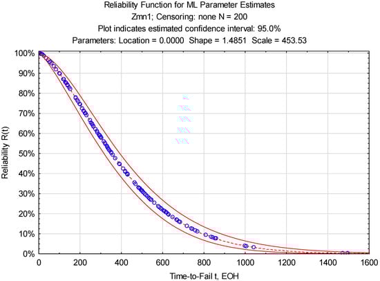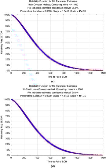 The assumed confidence interval results in the fact that is very likely (degree of probability—95%) that the plots and, in consequence, the reliability functions R(t) based on the empirical use-to-failure periods (times-to-fail) are almost identical to those generated randomly.