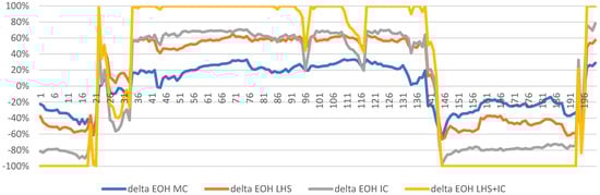 As shown in Figure 3, the actual state is best represented by the times-to-fail generated by the Monte Carlo (MC) method. The spread around the zero value is smallest among all the used methods. The sum of deviations is also the smallest as it amounts only to 510 EOH, compared to 1707 EOH (for the combined LHS and IC method) and 1821 EOH (for the LHS method only) in absolute terms. The least favorable results come from the IC method (as much as 2980 EOH difference).