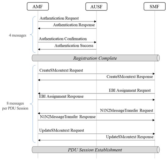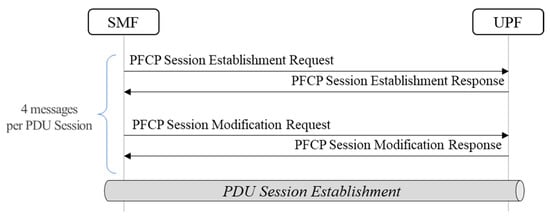 When UE registers with the 5G CN, HTTP/2 and PFCP messages are sent as shown in Figure 3 and Figure 4. In this regard, we counted the number of messages in protocols HTTP/2 and PFCP being generated when registering one UE in the 5G SA architecture. As a result, it was found that a total of 4 HTTP/2 messages are generated during the authentication procedure on the registration flow. Moreover, when assuming that a user generally uses the internet, voice call, and text messaging services, a total of 3 packet data units (PDUs) per service are activated. n HTTP/2 message for the establishment of 3 PDU sessions generates a total of 24 messages made up of 8 messages per PDU session. Additional messages exist for the PFCP. It generates a total of 12 messages, with each PDU session composed of 4 messages. To put together both HTTP/2 and PFCP, one UE triggers 40 CN protocol messages in total.