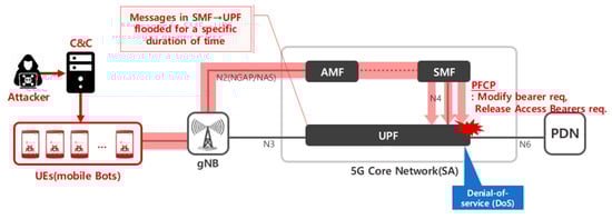 Signaling DDoS attacks can be targeted on RAN. Malicious actors may take advantage of the vulnerabilities of the RAN, designed for the efficient management of limited radio resources, which deprives resources from a mobile terminal unused for a specific period of time but allocates resources again to the terminal for allowing data reception/transmission over the network. It is also possible to deprive legitimate users of the service or resource they expected by depleting limited radio resources. If one base station is put into jeopardy or shut down caused by a DDoS attack, it brings about service outage within a geographic coverage of about 20 km2 only. However, if a DDoS attack is successfully perpetrated into any CN-layer function, the resulting service outage overwhelms even one metropolitan city, meaning that the adverse ripple effect in the 5G service landscape is in a totally different sphere than ever before. It is, therefore, of paramount importance to respond to signaling DDoS attacks using 5G CN protocols.