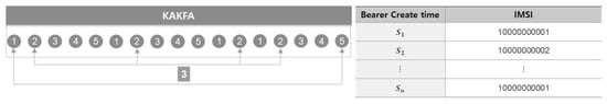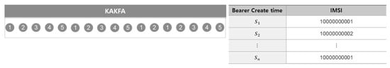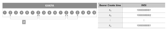 ① As depicted in Figure 6, we performed preprocessing as given below, for the total time value (t_total_time). The interval in time between the first traffic and the last travel of one user (identified by IMSI) for a duration of 1 min of unit time (S is a bearer or session create time):