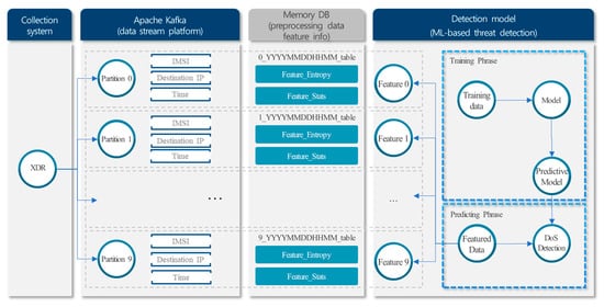 It is very difficult to process stream traffic data and detect security threats in a particular network [31]. In addition, it involves complex procedures to analyze traffic data in a 5G network environment. Therefore, research on DDoS attacks in the 5G network environment has a high barrier to entry. In the existing 5G cellular landscape, the trend of malicious DDoS events can be broadly categorized into two. The one pertains to any DDoS attack that abuses the control protocol used in the RAN, generally targeting a wireless base station by compromising the RRC protocol it uses in the RAN. The other pertains to any DDoS attack that exploits the control protocol used for voice services. Despite the fact that a lot of research has been conducted to cope with these two categorized events, there was no research exploring the applicability of AI-based ML against DDoS attacks targeting the CN, not the RAN or voice service network.