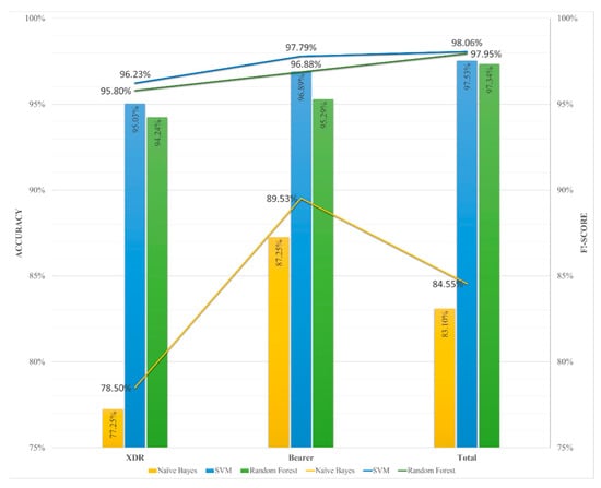 As shown in Table 15, the ML classifiers used in this study for performance evaluation of the detection algorithm are ① Naïve Bayesian, ② support vector machine, and ③ random forest. Simply put, the Bayesian classifier is relatively faster in training speed than the SVM and insensitive in parameter values when compared to other classifiers. On the other hand, the SVM classifier works well on the small number of data features, irrespective of dimensionality of data. In the case where there are many datasets (at least 10,000 sets), however, the SVM is severely dependent on data preprocessing and parameter values. Lastly, the random forest classifier does not work well on high-dimensional data but has high performance in view of accuracy [30]. So, in this study, the evaluation results manifest that the random forest achieves the best detection performance, with an accuracy of 99.8%.