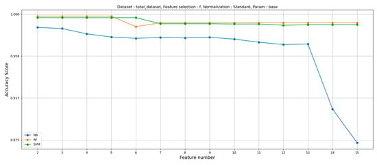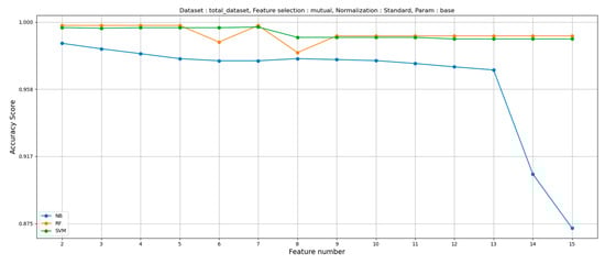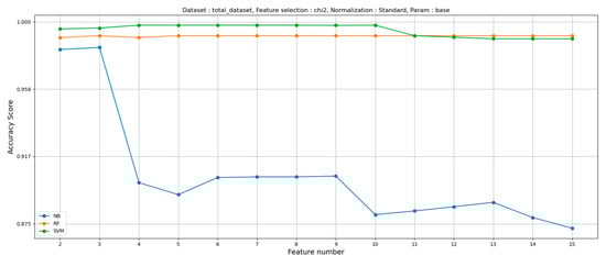 The result of the test demonstrates that the detection accuracy of individual ML classifiers also varies depending on the number of features selected when using the feature selection technique. As described in Section 4.3, features were selected using three statistical models. They were ① chi square test, ② analysis of variance (Anova) F test, and ③ mutual information test, whereby the accuracy of each ML classifier was measured with the application of these statistical models. Figure 19 shows the detection accuracy depending on the number of selected features when the chi square test is used to select features.