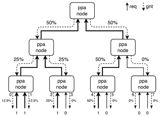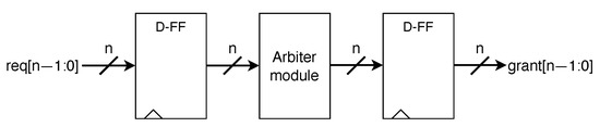 - Shin, E.S.; Mooney, V.J.; Riley, G.F. Round-Robin Arbiter Design and Generation. In Proceedings of the 15th International Symposium on System Synthesis, Kyoto, Japan, 2–4 October 2002; Association for Computing Machinery: New York, NY, USA, 2002; pp. 243–248. [Google Scholar]