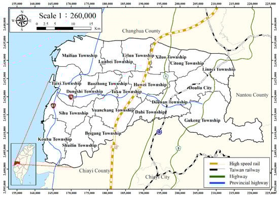 The study area is Yunlin County in the Choshui alluvial fan, known for its agriculture and situated at the central-south part of western coast of Taiwan. Yunlin County covers 1290.84 km2 and is divided into 20 villages, as illustrated in Figure 1. The county is part of the Chianan Plain in which 90% of Yunlin County are plains with an annual average temperature of 23 °C and yearly rainfall of 1028.9 mm. According to Figure 1, high speed rail, highway (no. 1 and no. 3) and provincial highway (no. 61 and no. 78) pass through Yunlin County.