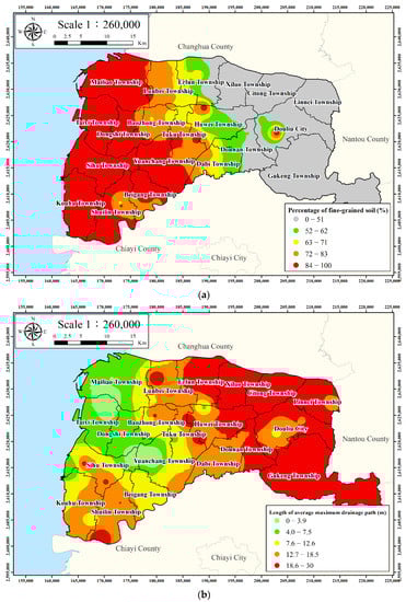 where denotes the percentage of fine-grained soil and denotes the soil thickness of fine-grained soil. Figure 2a shows the percentage of fine-grained soil of Yunlin County. According to Figure 2a, it is clear that the percentage of fine-grained soil in the near shore land zone of western Yunlin County is higher than that of the eastern Yunlin County.
