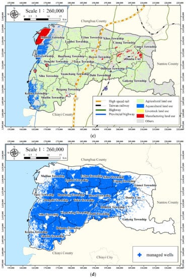 The thematic map of land use inventory of Yunlin County is illustrated in Figure 2c. The study area is classified into nine land use types, including agricultural land, forestry land, transportation land, hydrological land, construction land, public facility land, recreational land, mine industry land, and other regulation district [28], as depicted in Figure 2c. As demonstrated in Figure 2c, the land use in Yunlin County is mainly categorized as agriculture.